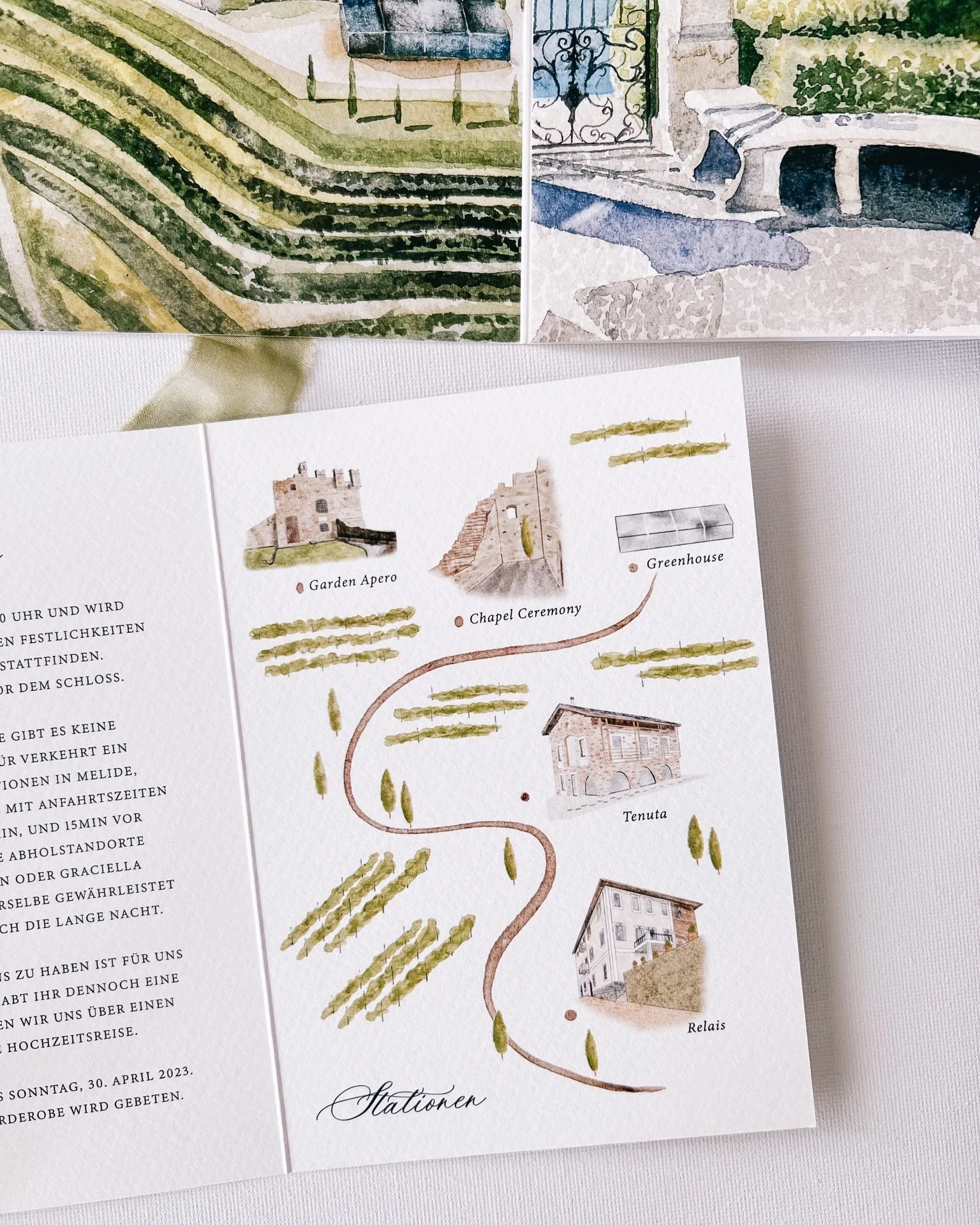 What’s so exceptional about including a custom map in your suite, is that it makes your invitations stand out. You’ll be providing your guests with a complete picture of your wedding day, long before they arrive. Each venue illustration is made entirely from scratch, and personalized to you.
